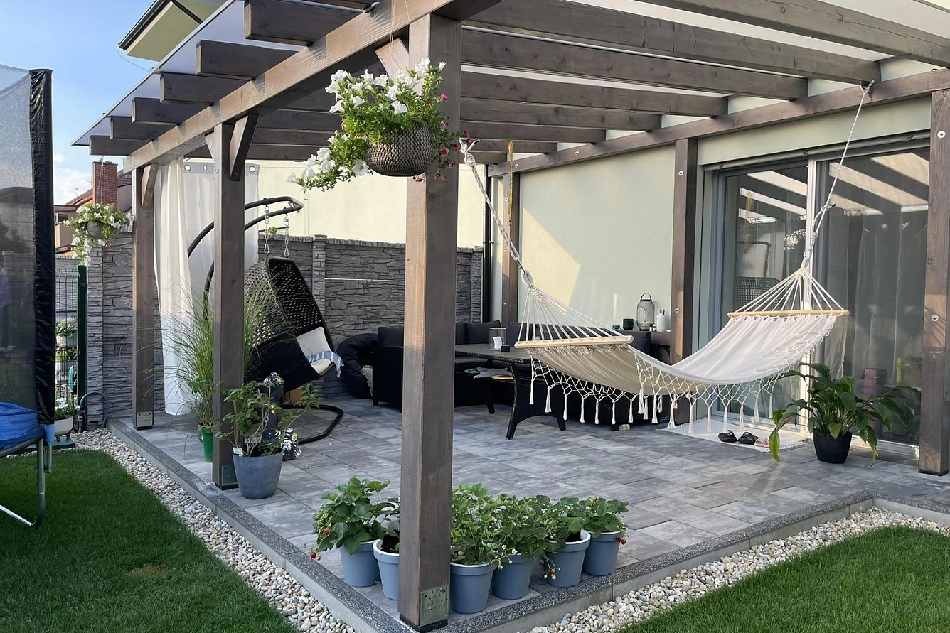 - Terasa s pergolou (5,6 × 4,5 m) s integrovaným LED osvětlením, 1 rok stará