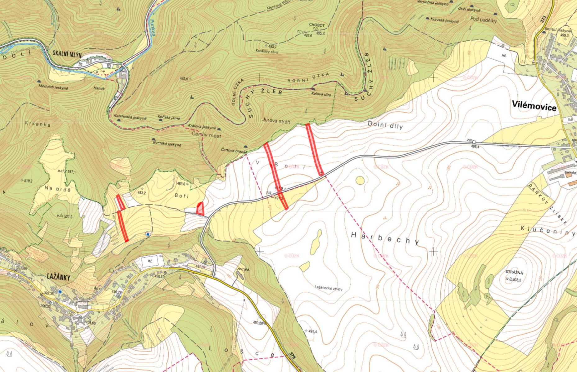 na listu vlastnictví č. 47 v katastru Lažánky u Blanska (parcely č. 647/4, 672/4, 673/3, 679/7, 680/3 a 717/65)
