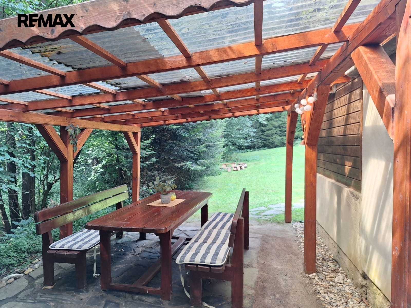 Vlastní pozemek o rozloze 668m2, naskýtá plno možností kde se dá trávit čas, u ohně, pod pergolou, v dílně s ponkem a elektřinou, nebo u potoka u vytvořené sádky na ulovené kapry.