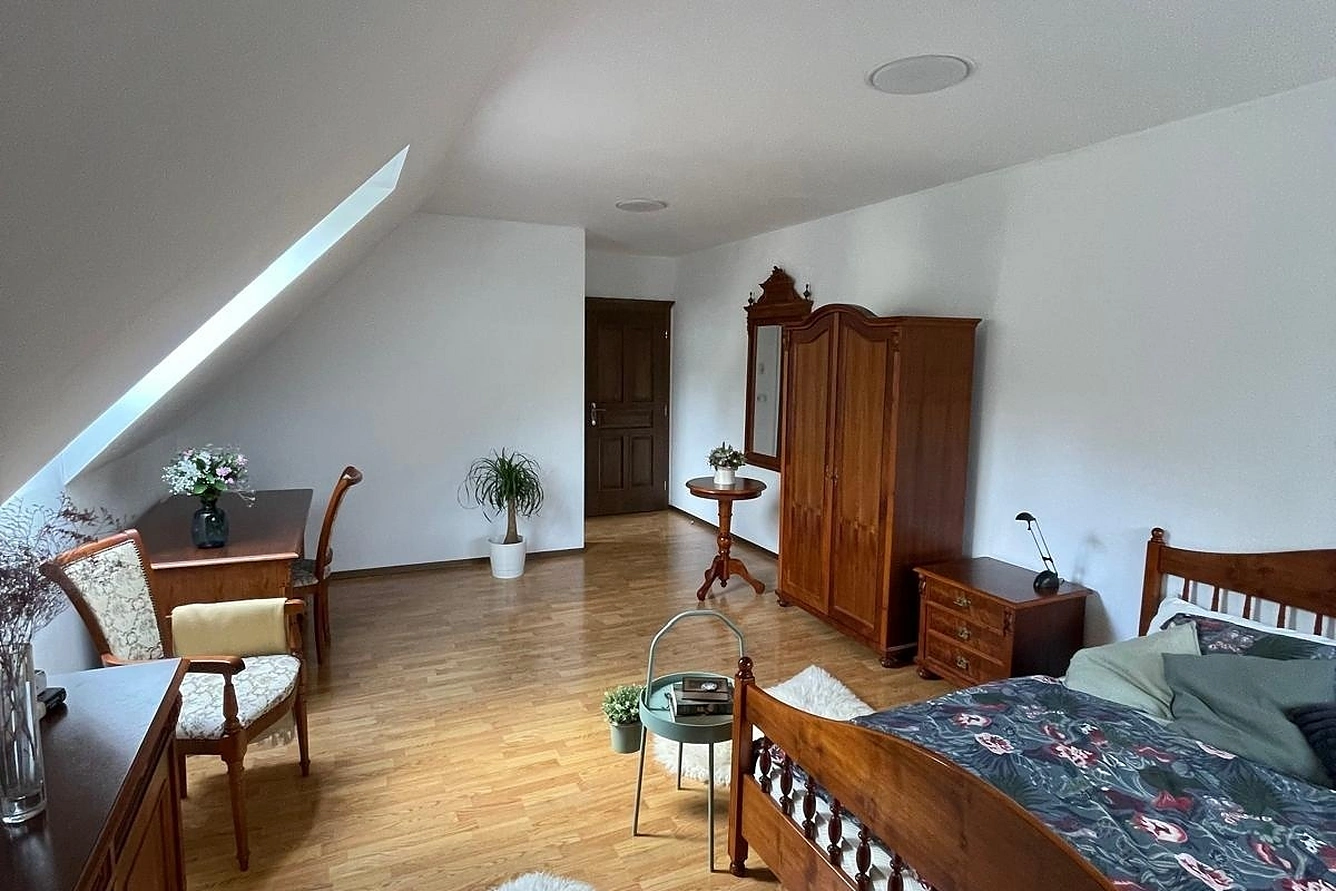 Pokoj o výměře 33,23 m² je světlý s okny orientovanými do dvou světových stran. Koupelna se sprchovým koutem a toaletou je odvětraná střešním oknem. Součástí podnájmu bytu je kuchyňský kout situovaný v přízemí domu a také přiléhající prostornou terasu s grilem.