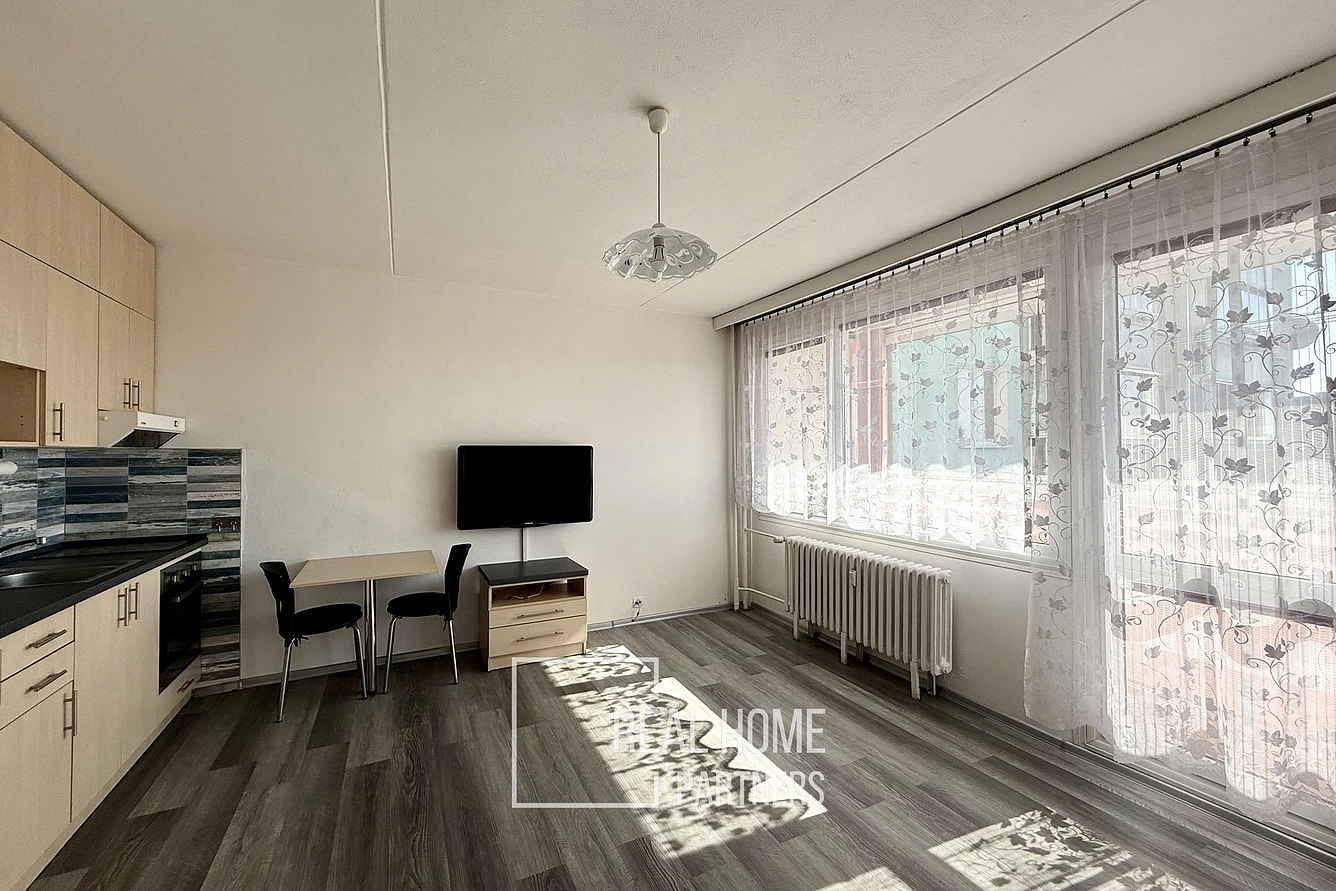 Dispozice: vstupní chodba se šatnou, obytný prostor s kuchyňským koutem, koupelna s WC, lodžie. Všechno má své místo, žádné hluché metry.