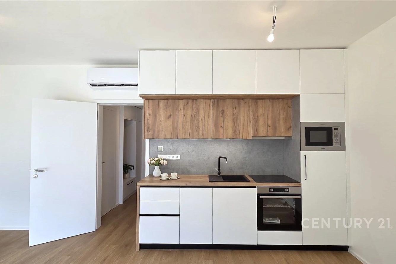 Byt se nachází ve 2. NP s okny i terasou orientovanými na jih. Je nabízen následovně vybaven: spotřebiči vybavená kuchyňská linka, předsíňová stěna, koupelna s toaletou a sprchovým koutem, bojler na ohřev vody, klimatizace (s možností topení v chladném období). Byt je vytápěn elektrickým podlahovým topením.