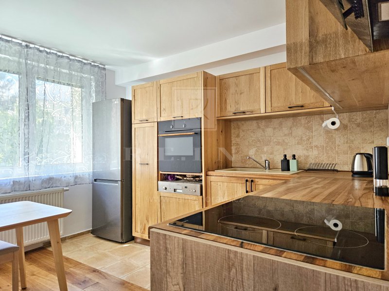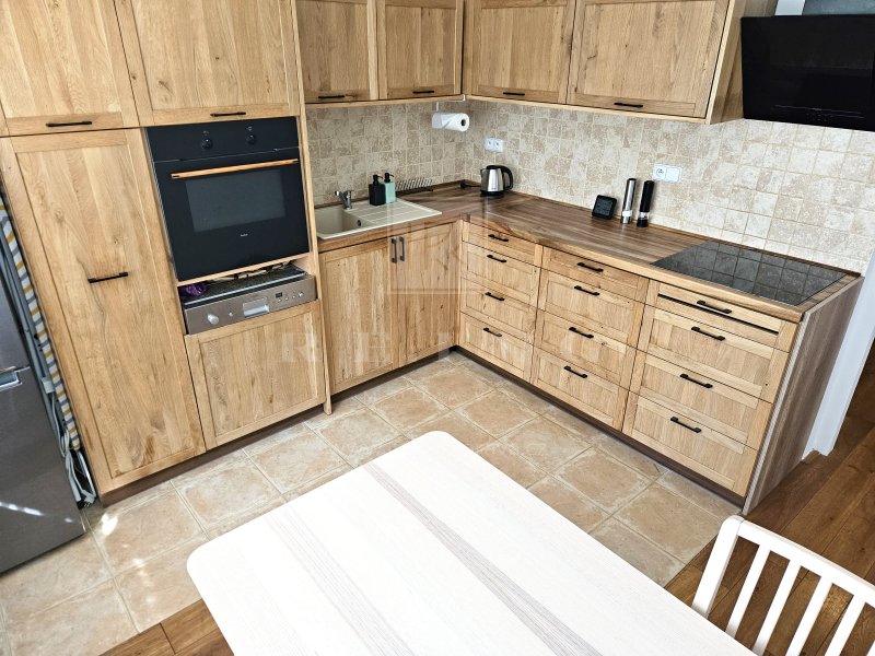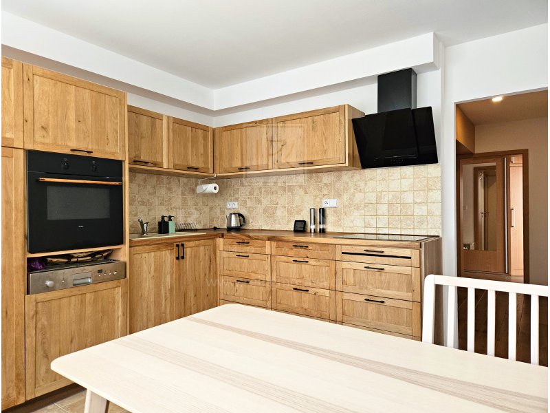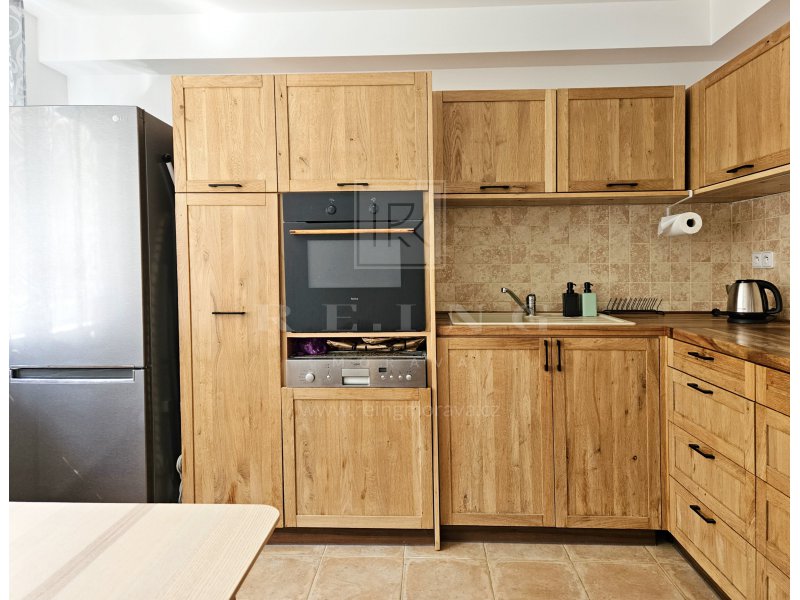 kuchyňská linka se spotřebiči ( trouba, varná deska, mikrovlnka, lednice s mrazákem) + jídelní stůl se židlemi